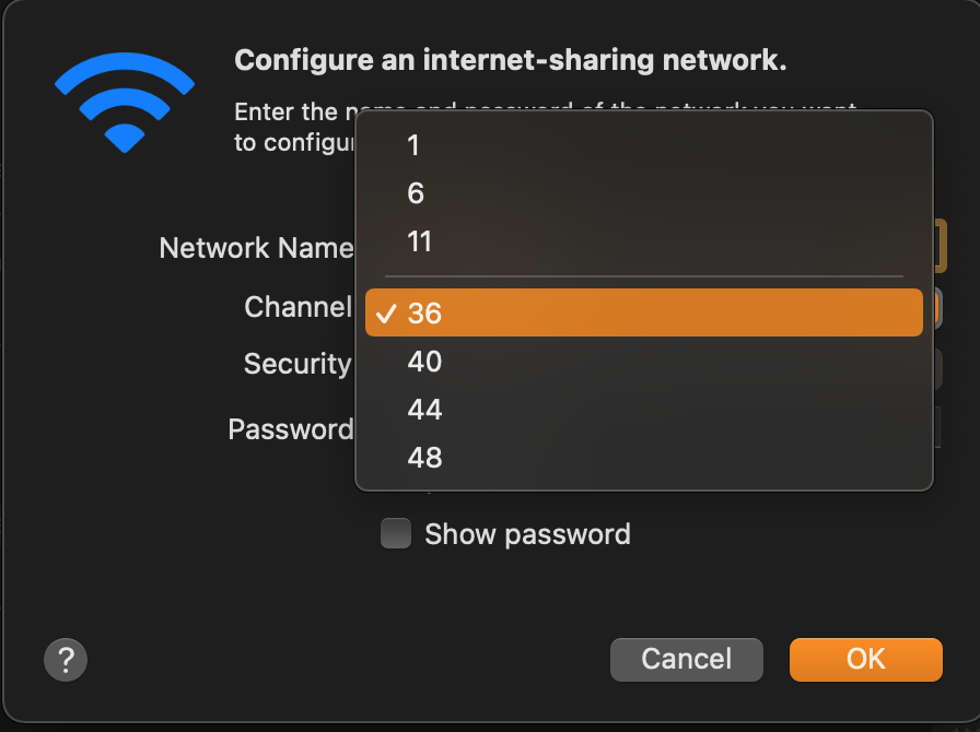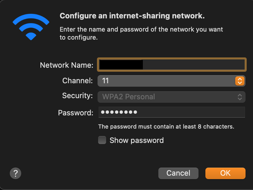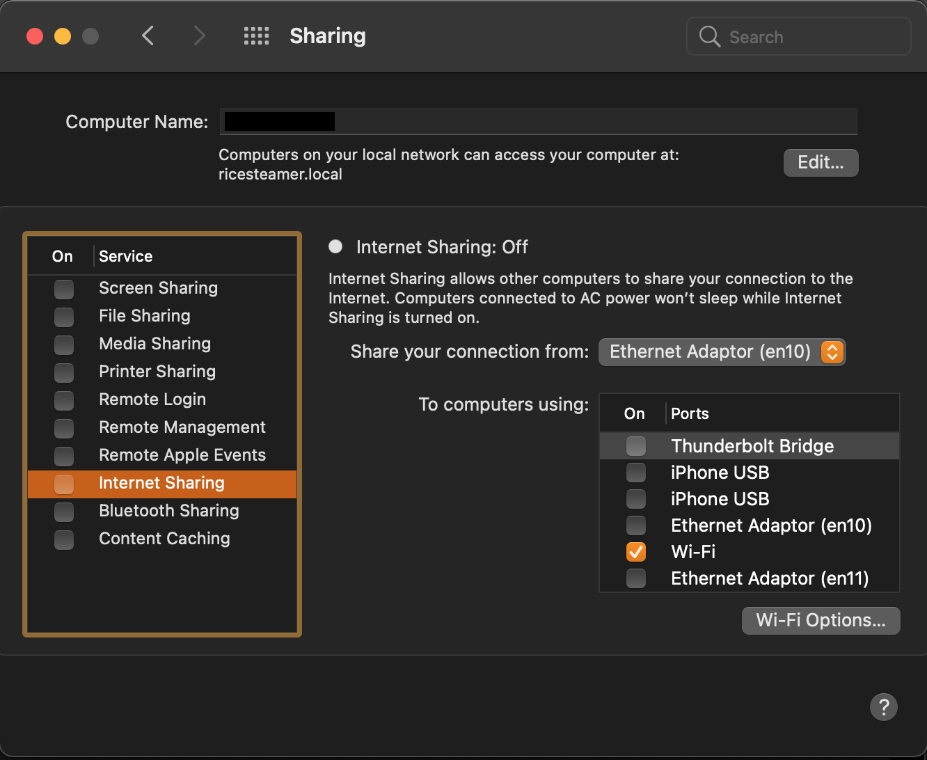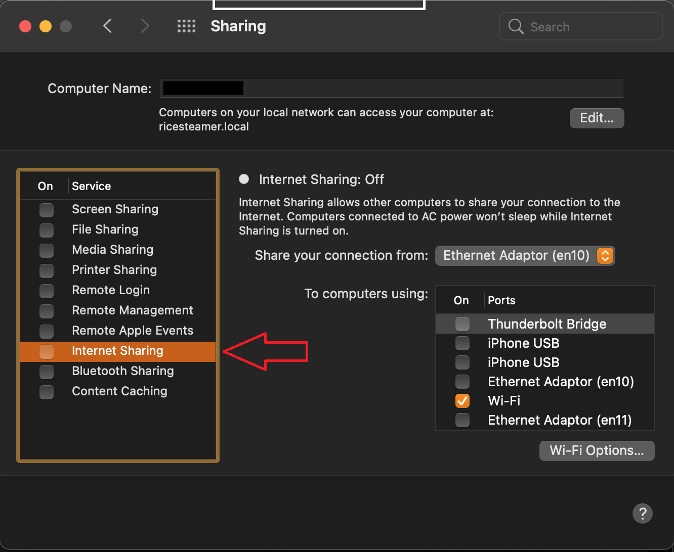 7. Once you’ve set your SSID, password and channel under WiFi Options, check the Internet Sharing checkbox on the left.